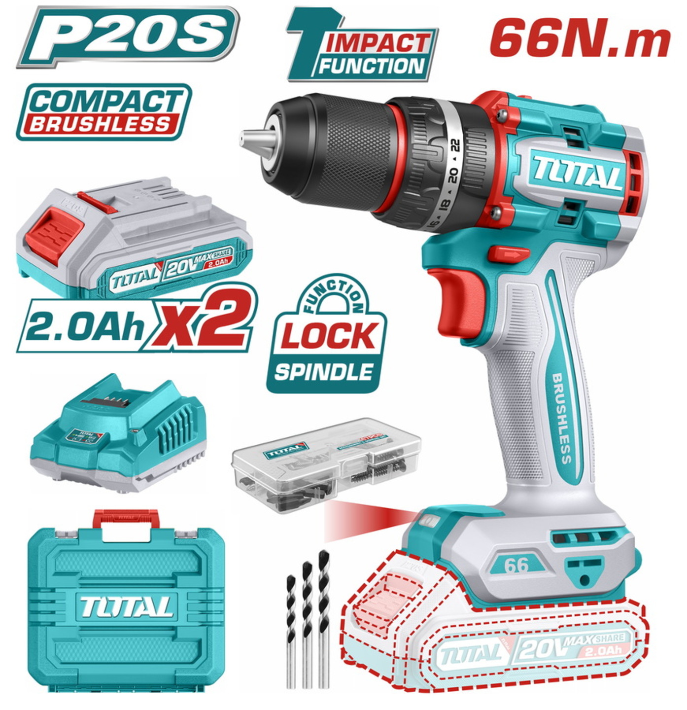 TOTAL ΕΠΑΓΓ. ΔΡΑΠΑΝΟΚΑΤΣΑΒΙΔΟ ΚΡΟΥΣΤΙΚΟ ΜΠΑΤ. Li-ion 20V / 2Ah / 66Nm / 2 ΜΠΑΤ BL Motor (TIDLI20668E)